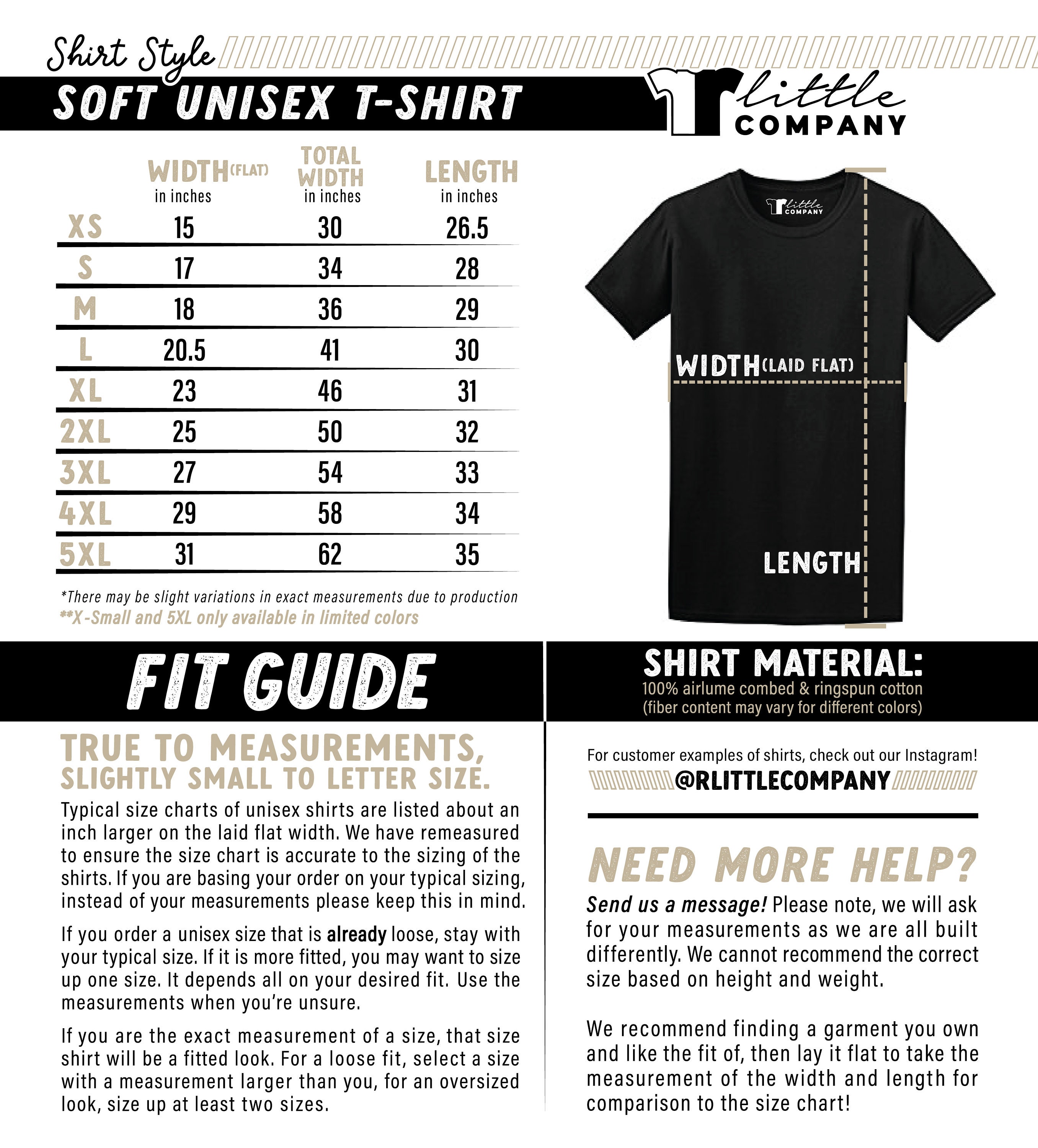 Please note, if you are the exact measurement of the size chart, that garment will give you a fitted look since both measurements match. If you wish for a looser fit, we recommend sizing up one. For an oversized look, we recommend sizing up two sizes.