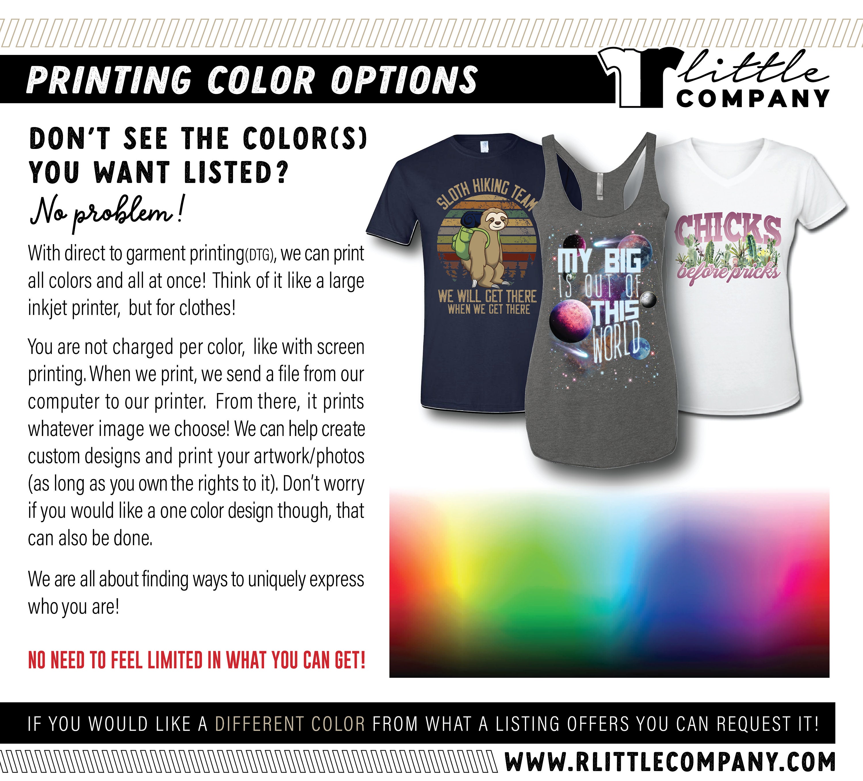 Because we use direct to garment printing, we can print AS MANY COLORS as you would like Think of a direct to garment printer as a giant inkjet printer -- but for clothes! Pricing would be based on design size, instead of the amount of colors. So for orders you can request images, textures, patterns, flags, etc. at no extra cost.