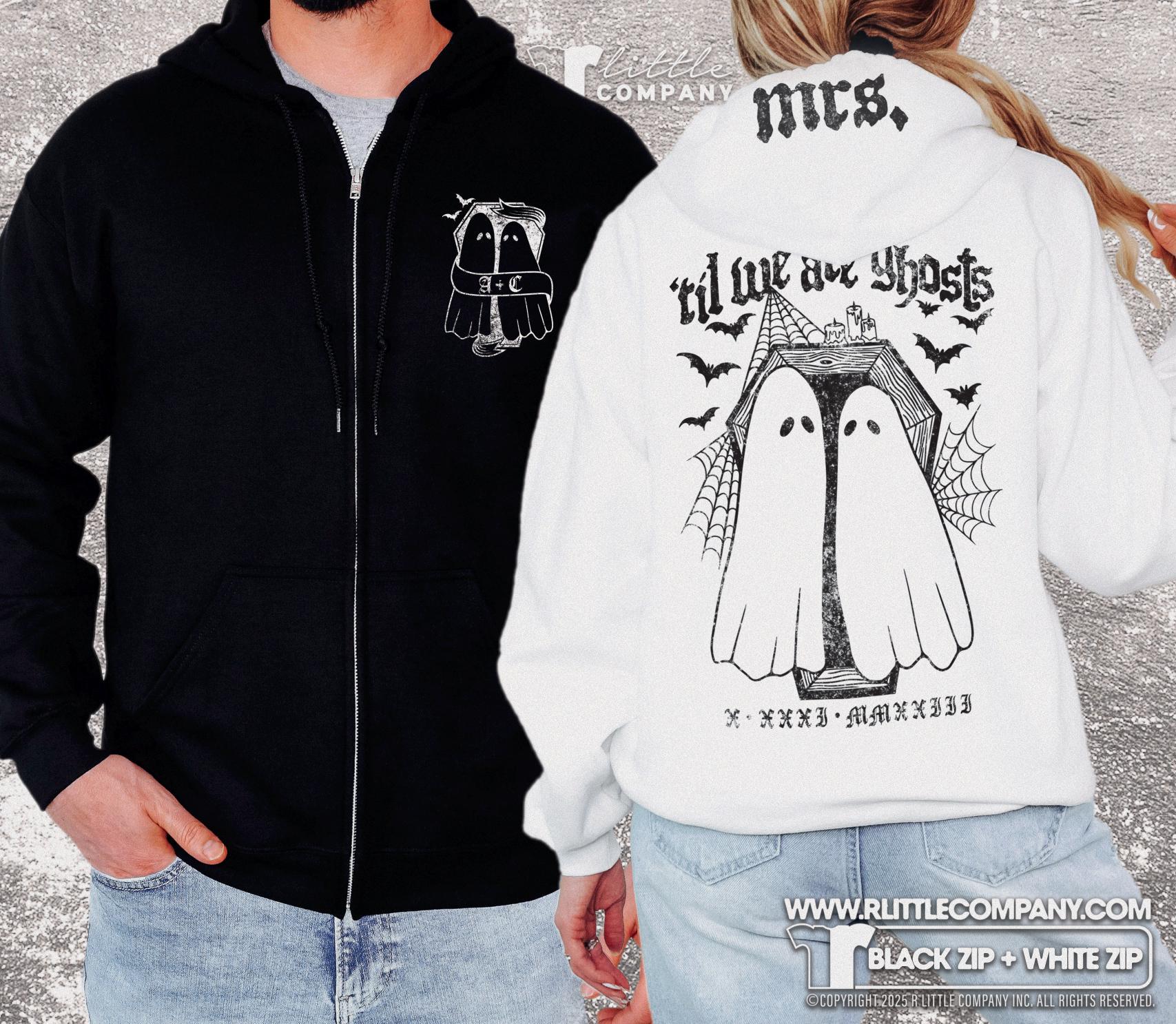 Embrace your inner goth and flaunt your unique bond with our ghost coffin design that scream "couple goals." From the mischievous spirits to the bone-chilling phrase "Til We Are Ghosts," these zip hoodies are the perfect fusion of spooky and sweet. So, whether you're strolling hand in bony hand at the pumpkin patch or enjoying a candlelit dinner in a haunted house, our matching sweatshirts will keep you in sync and in style!