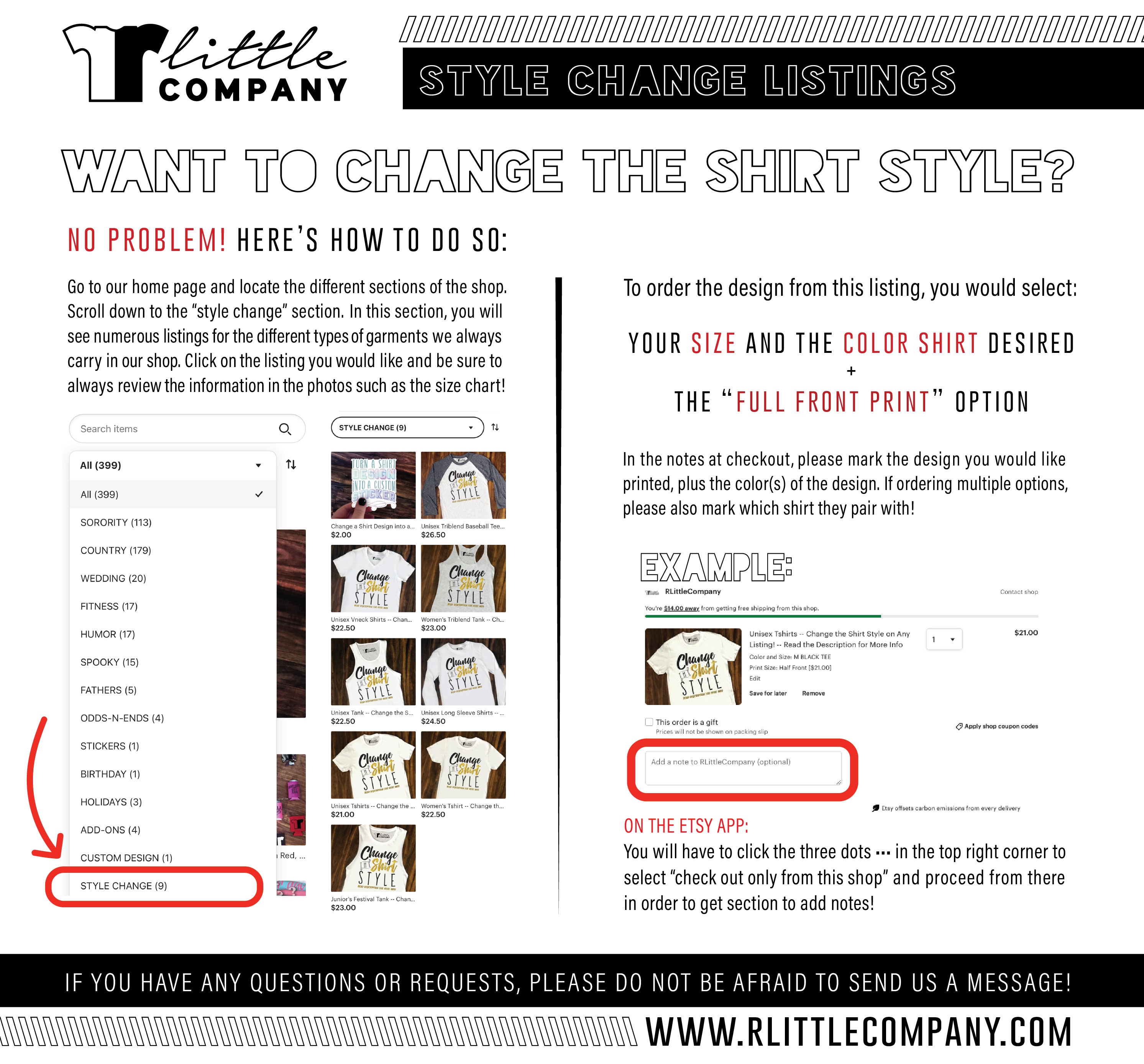 Go to the “Style Change” section in the shop and select the listing you desire to print on. You would only need to mark the design and design color in the notes at checkout!