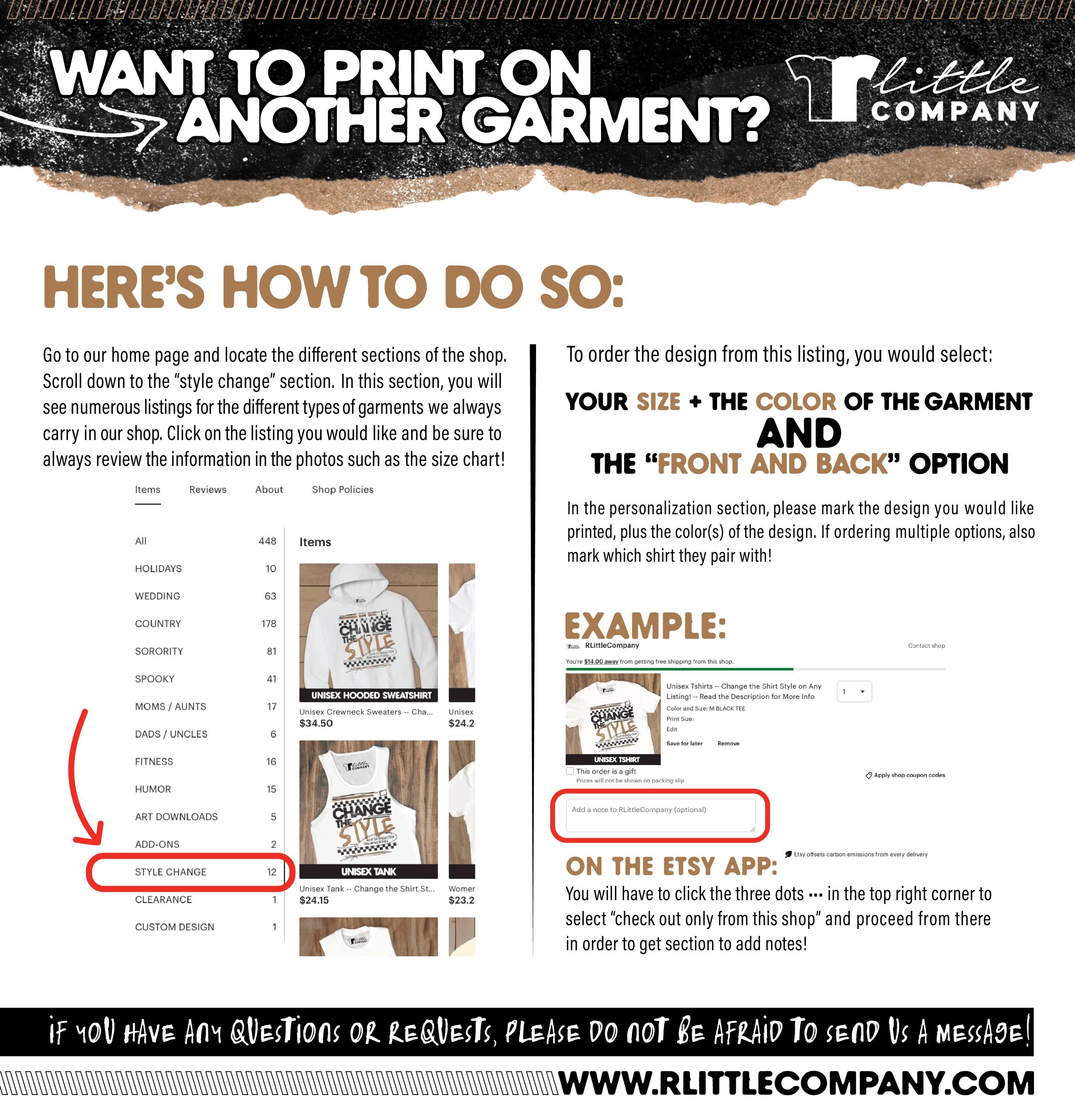 Go to the “Style Change” section in the shop and select the listing you desire to print on. You would only need to mark the design and design color in the notes at checkout!