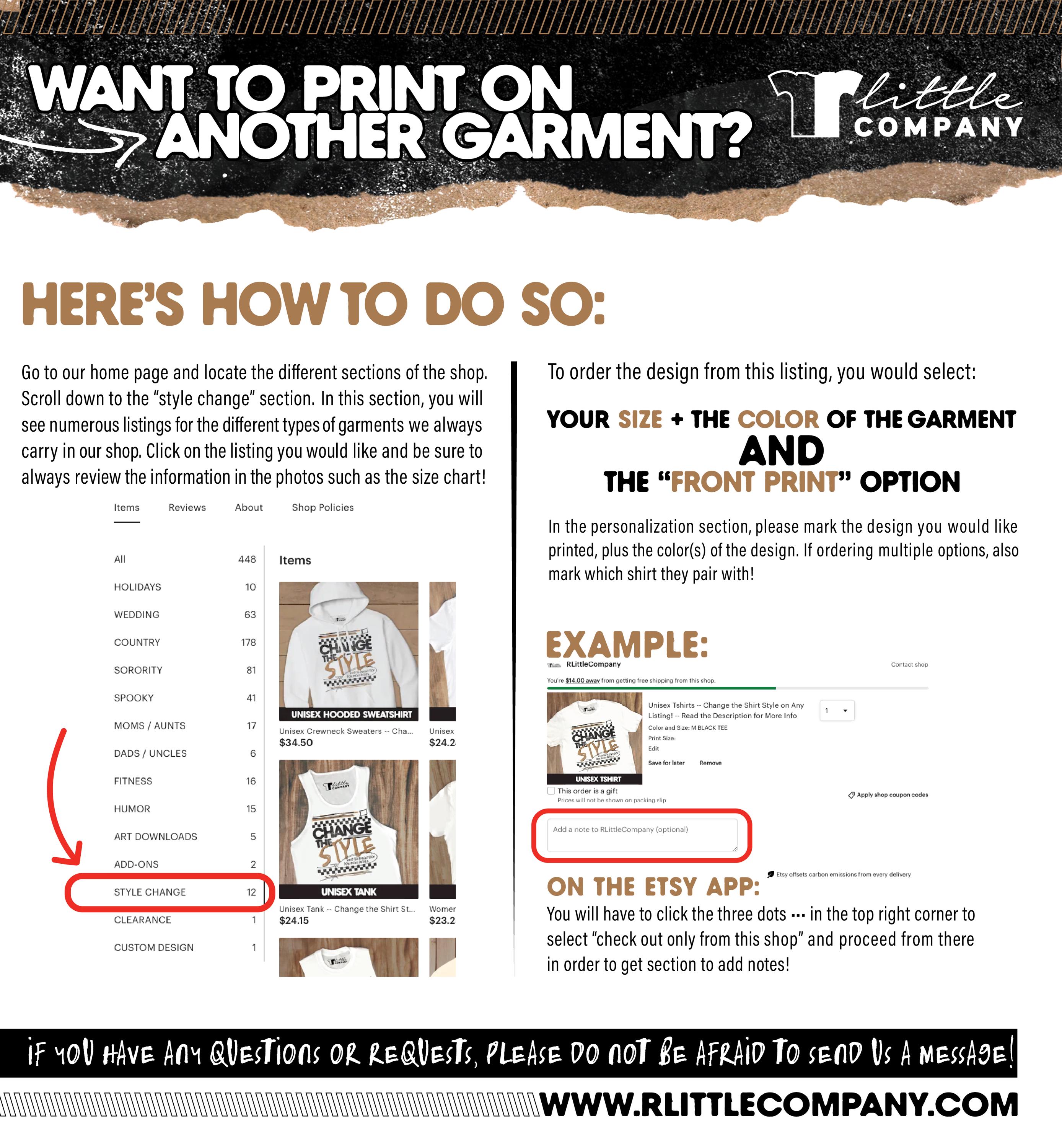 Go to the “Style Change” section in the shop and select the listing you desire to print on. You would only need to mark the design and design color in the notes at checkout!